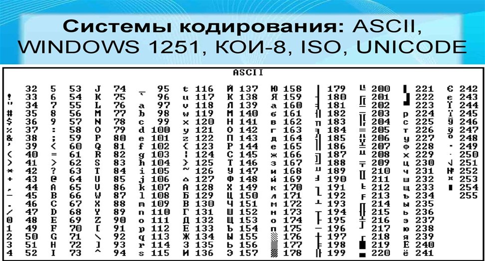 Код ASCII (American Standard Code for Information Interchange) используется для внутреннего представления символьной информации в операционной системе MS DOS, в Блокноте операционной системы Windows’xx, а также для кодирования текстовых файлов в Интернет. Структура кода представлена в таблице (обозначения столбцов и строк выделены полужирно).