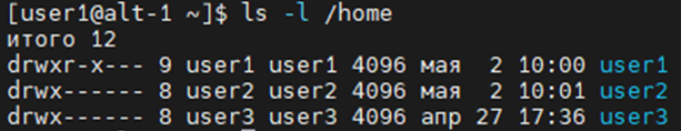 В выводе обратите на права доступа к домашнему каталогу user1: