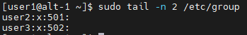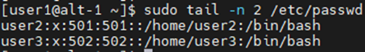 Из этого вывода видно, что домашний каталог пользователя user2 находиться по пути /home/user2, так же видна используемая оболочка /bin/bash (бывают также /bin/sh и /bin/zsh)
