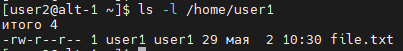 Как видите мы из-под пользователя user2 имеем доступ к домашней директории user1. Давайте теперь попробуем вывести содержимое этого файла: