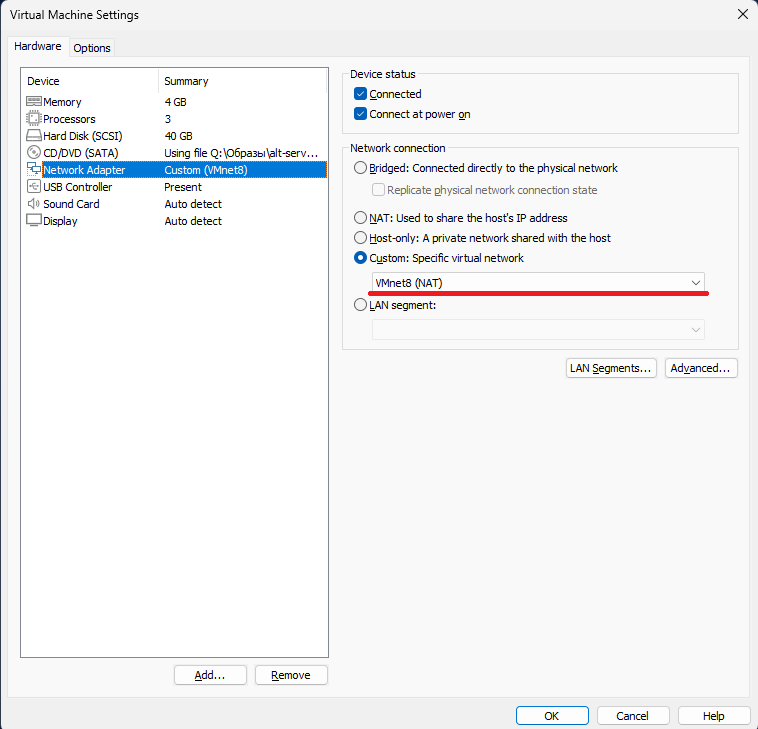 Выберете «Подключение Ethernet1» и дважды нажмите Enter: