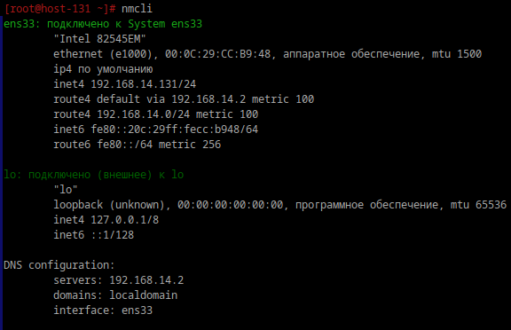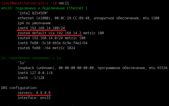 Как видите эта команда похожа на “ip a”, но имеет более подробный вывод. Здесь вы можете заметить: MAC-адрес и IP-адрес интерфейсов, маршрут по умолчанию, конфигурацию DNS.