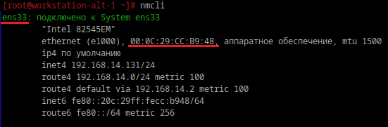 В моем случае имя интерфейса – ens33, MAC – 00:0C:29:CC:B9:48. Ваш MAC-адрес будет отличаться от моего.