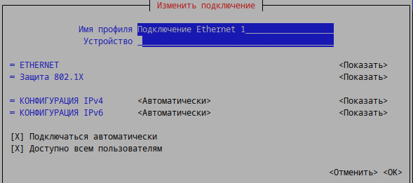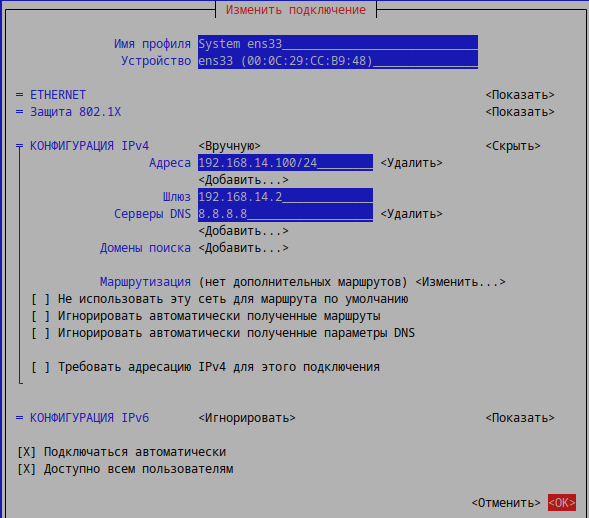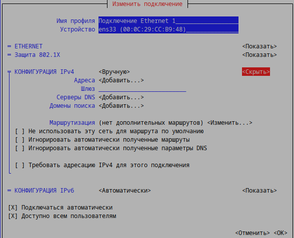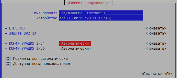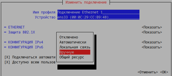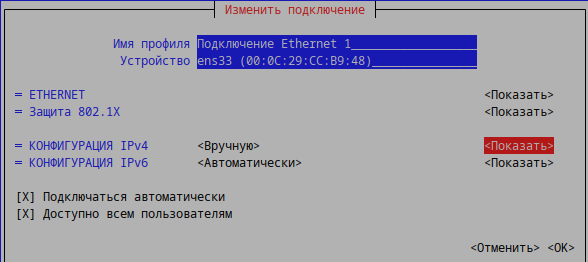 У вас должна появиться * возле названия интерфейса. Как вы можете заметить после того, как вы включили интерфейс «Подключение Ethernet 1» выключился System ens33. Это вызвано тем, что это фактически один и тот же интерфейс, просто System ens33 управляется графической оболочкой и мы не можем его изменять через Network Manager.