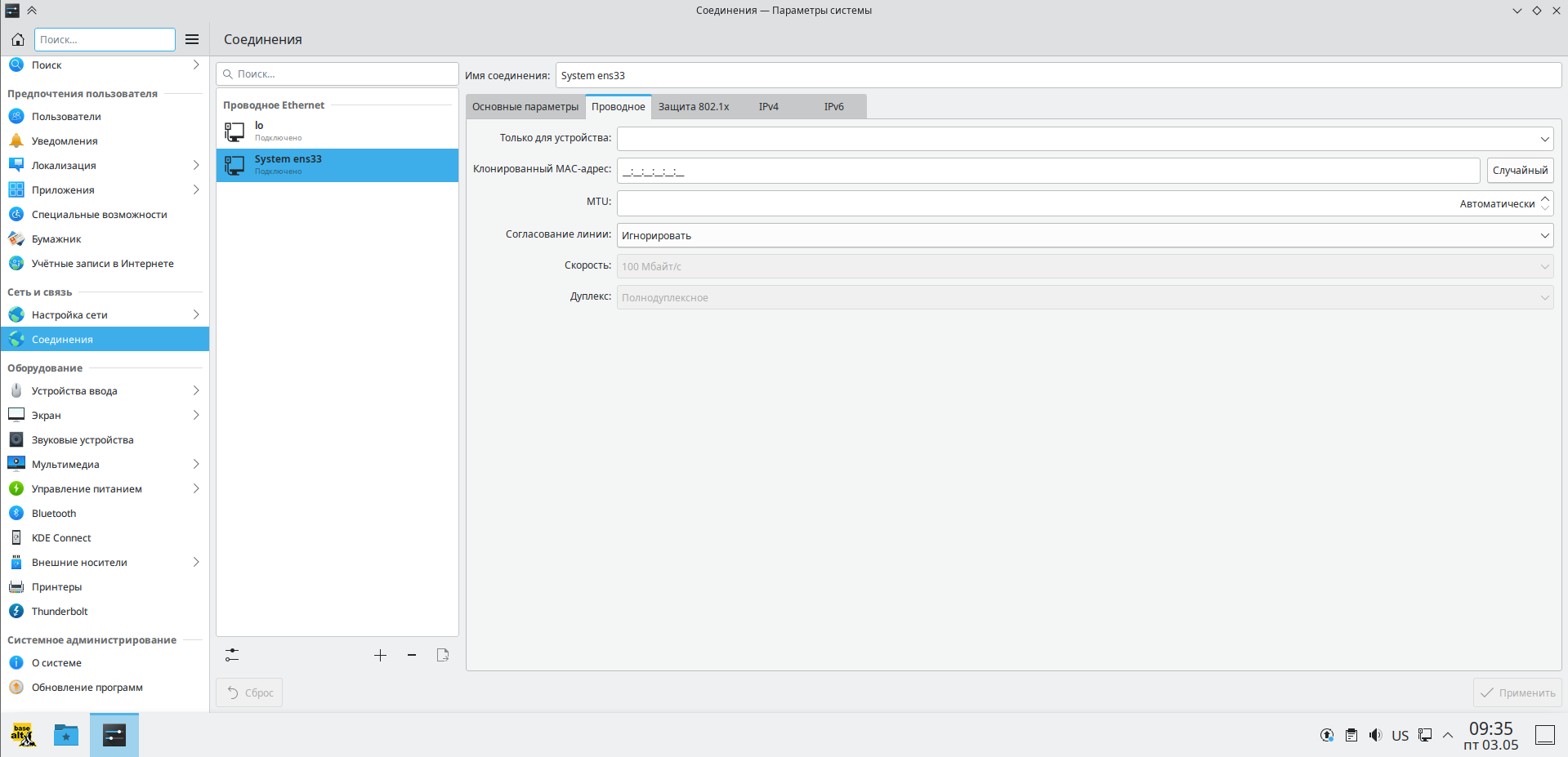 В ОС ALT Workstation (K) есть нюанс – среда рабочего стола («Параметры системы») берет управление сетью на себя, из-за этого произвести настройку сети через сторонние утилиты (Network Manager и др.) становится сложнее. При этом настройка через Etcnet все также достаточно удобна.