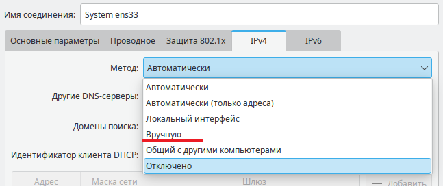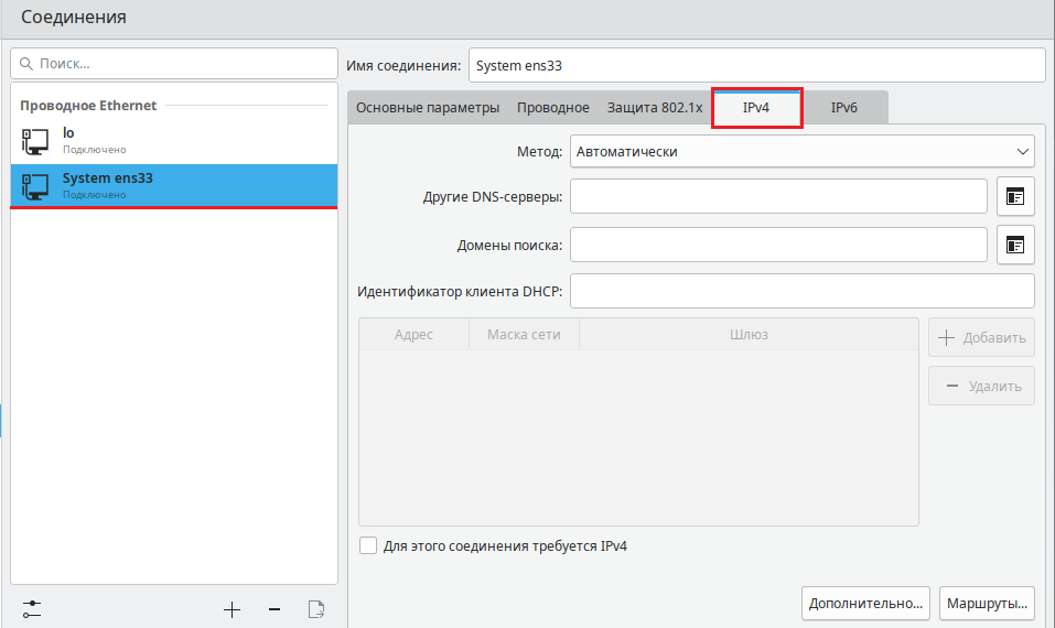 Здесь нас интересует интерфейс «System ens33» и вкладка «IPv4»: