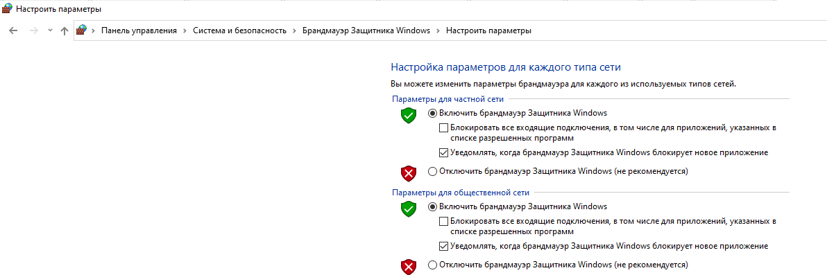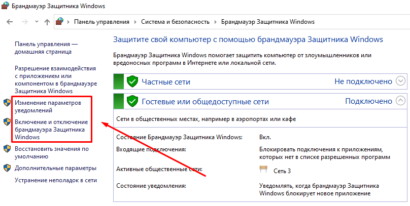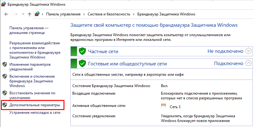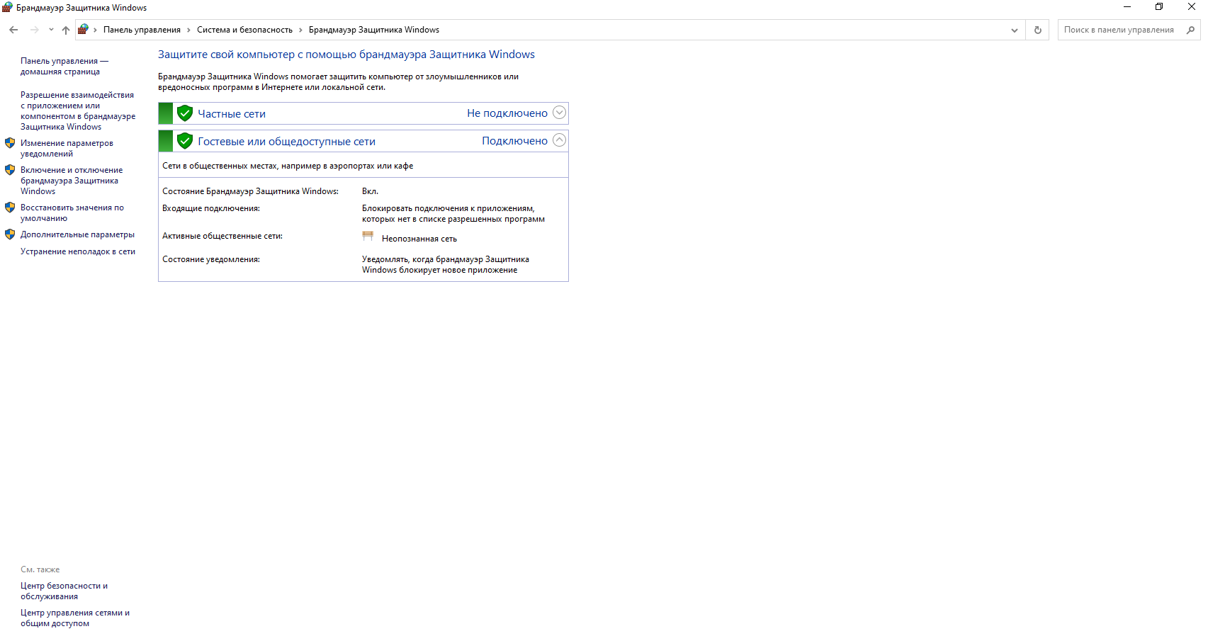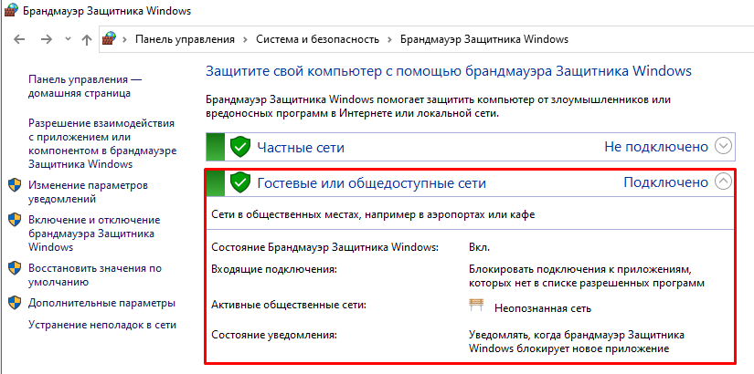 Открыв Брандмауэр в панели управления, вы увидите окно, где можно увидеть, включен ли он, тип сети, к которой вы подключены: частные сети или общедоступная сеть.