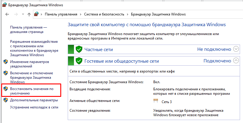 В случае, если вы сделали какие–то некорректные правила или что–то пошло не так, можно вернуть Брандмауэр к параметрам, которые были заданы при установке системы.