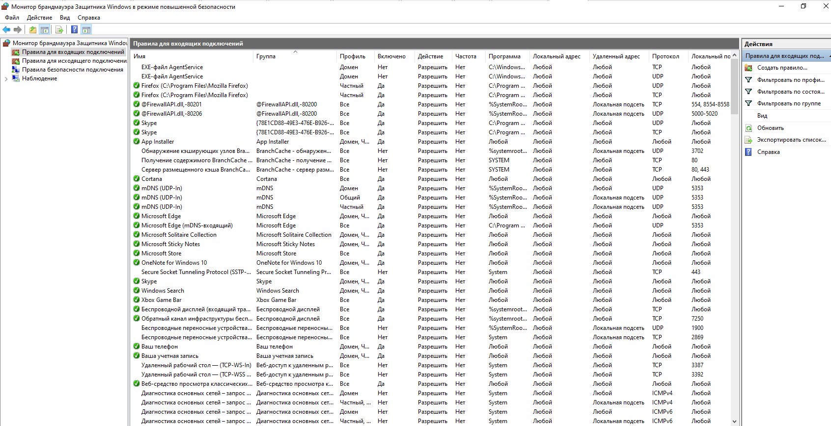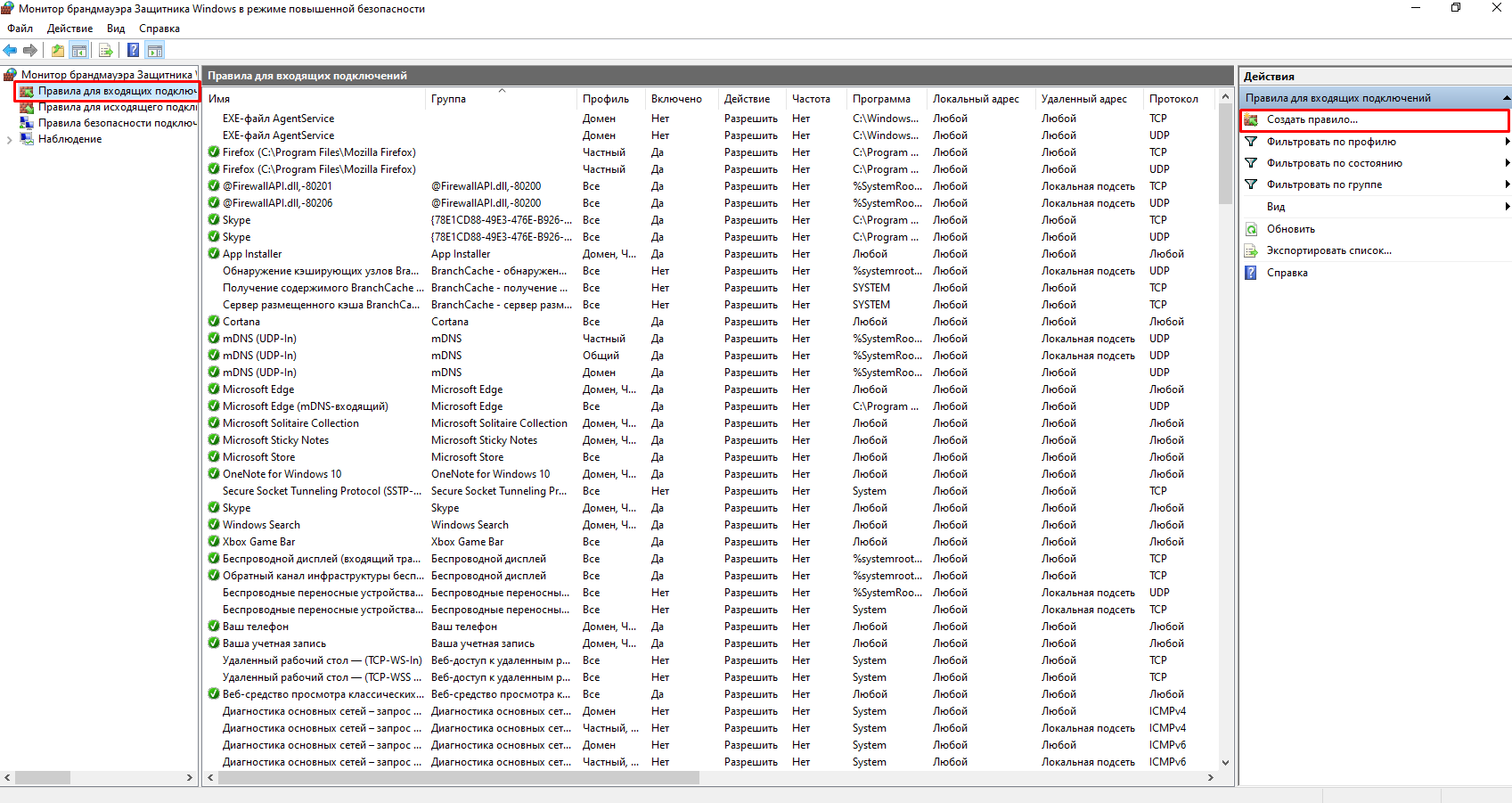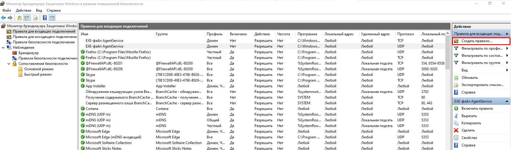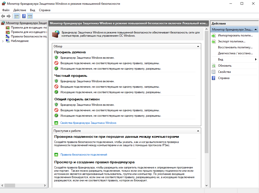 Брандмауэр Windows теперь открыт в режиме повышенной безопасности. Здесь сохраняются и редактируются все правила на продвинутом уровне.