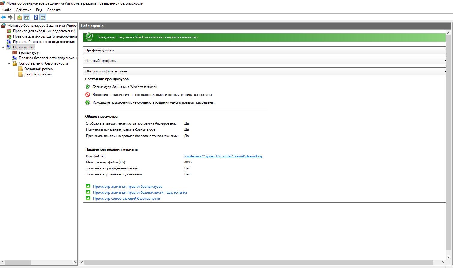 В разделе «Наблюдение можно просмотреть активные правила брандмауэра, правила безопасности активных соединений и сопоставления безопасности.