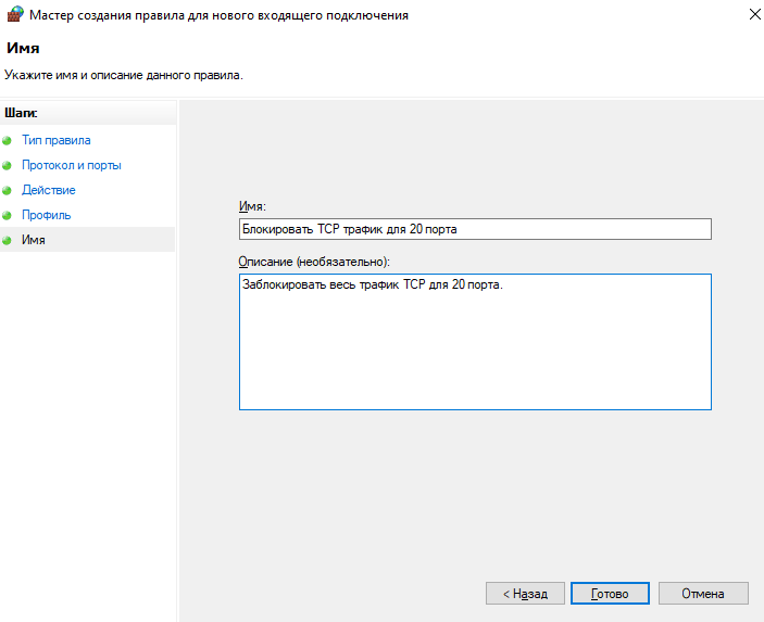 Назначаем имя и описание для нашего правила: