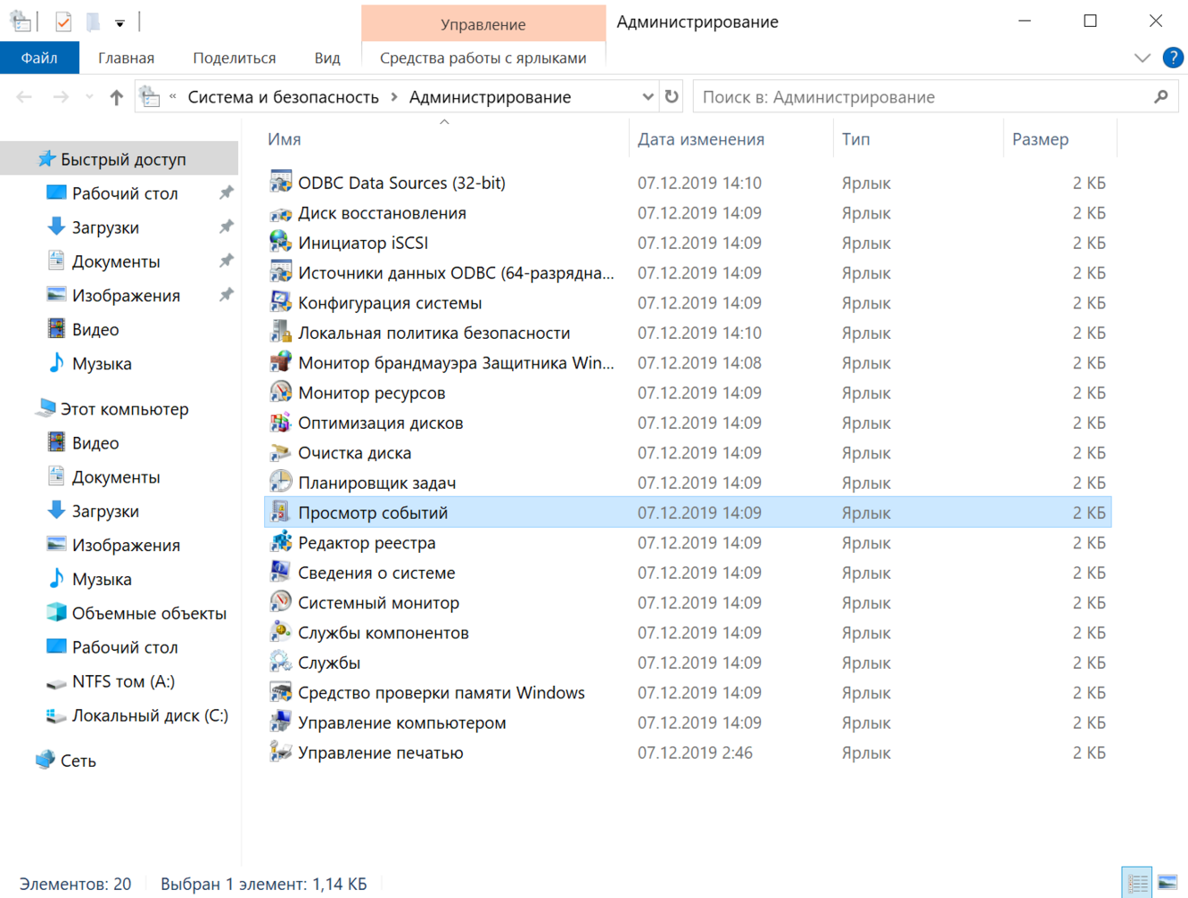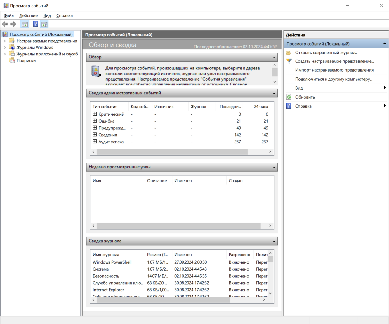 В левой панели находится древовидная структура, в которой отсортированы события по различным параметрам. Кроме этого, сюда же можно добавить собственные «Настраиваемые представления», в которых будут отображаться лишь нужные вам события.