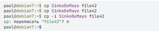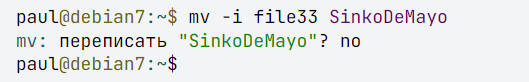 В примере ниже показано, как при использовании команды mv -i запрашивается подтверждение перезаписи существующего файла.