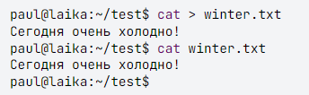 Также вы можете использовать утилиту cat для создания текстовых файлов. Введите команду cat > winter.txt, приведенную в примере ниже. После этого введите одну строку или несколько строк текста, завершая ввод каждой из строк нажатием клавиши Enter. После ввода последней строки текста нажмите и удерживайте клавишу Ctrl и одновременно с этим кратковременно нажмите клавишу d.
