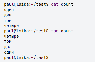 Предназначение утилиты tac (в отличие от утилиты cat) может быть проиллюстрировано с помощью единственного примера.
