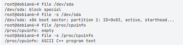 Важно отметить, что для работы с такими специальными файлами, как файлы из директорий /dev и /proc, следует использовать команду file -s.