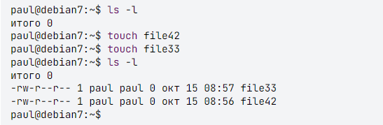 Данный пример начинается с открытия пустой директории, в которой с помощью утилиты touch создаются два файла, после чего выводится список созданных файлов.