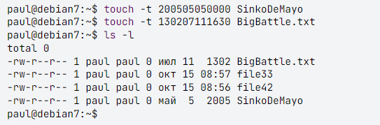 Утилита touch позволяет устанавливать набор значений свойств пустых файлов в процессе их создания. Удастся ли вам определить, какие значения свойств были установлены, ознакомившись с приведенным ниже примером? Если вы не смогли разобраться самостоятельно, обратитесь к странице руководства для утилиты touch.