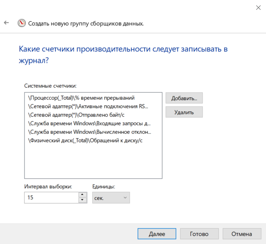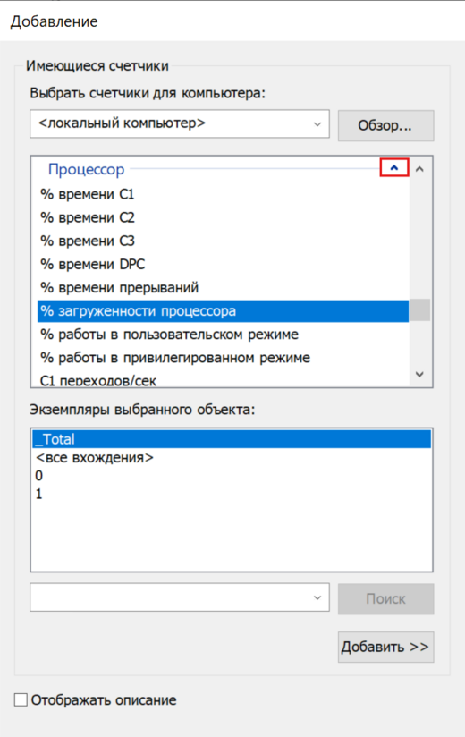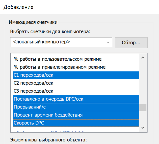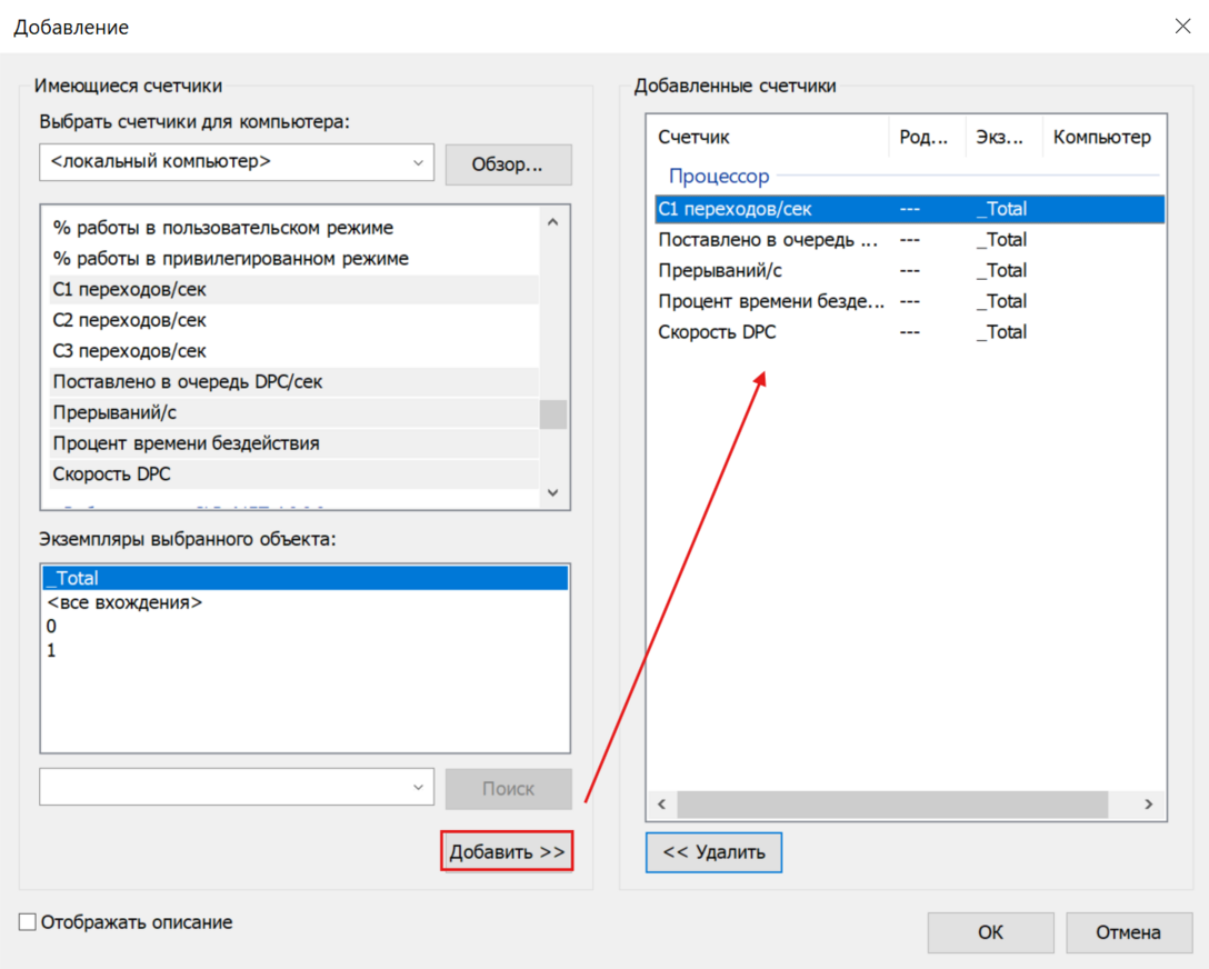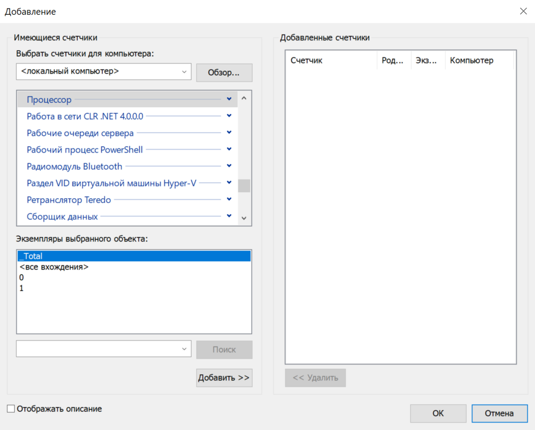 Теперь разверните категорию счетчиков, которые вы хотите. Например процессор.