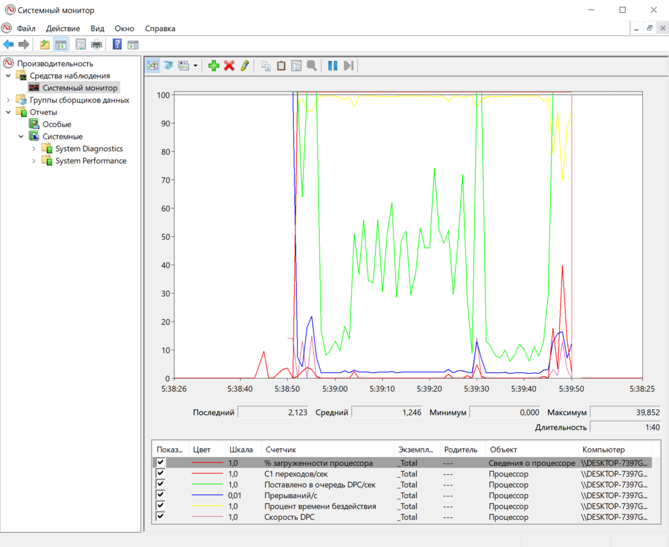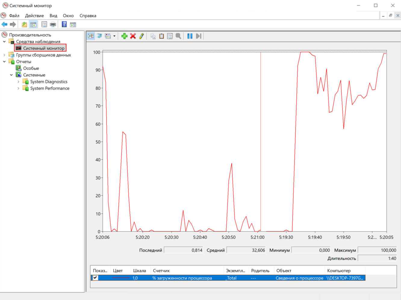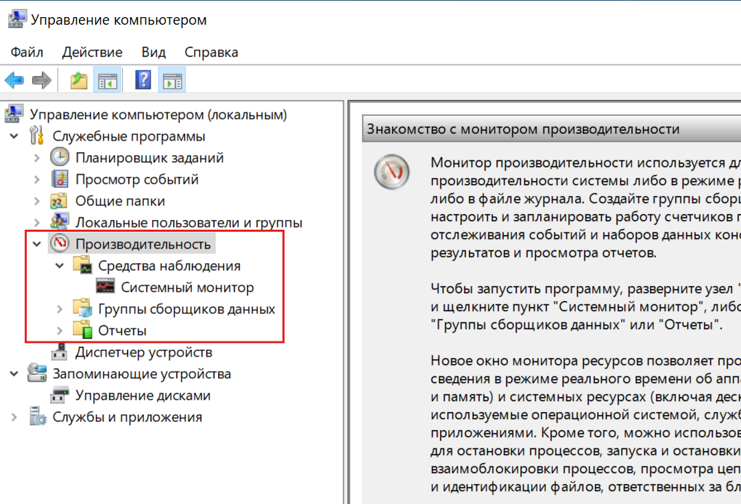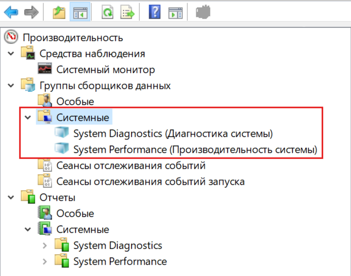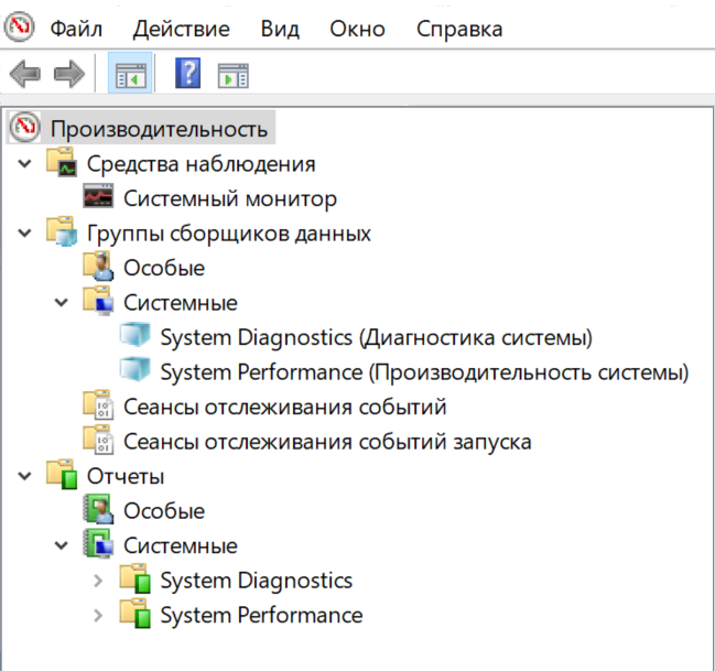 Чтобы открыть системные отчеты, разверните «Отчеты» на левой панели окна «Производительность».