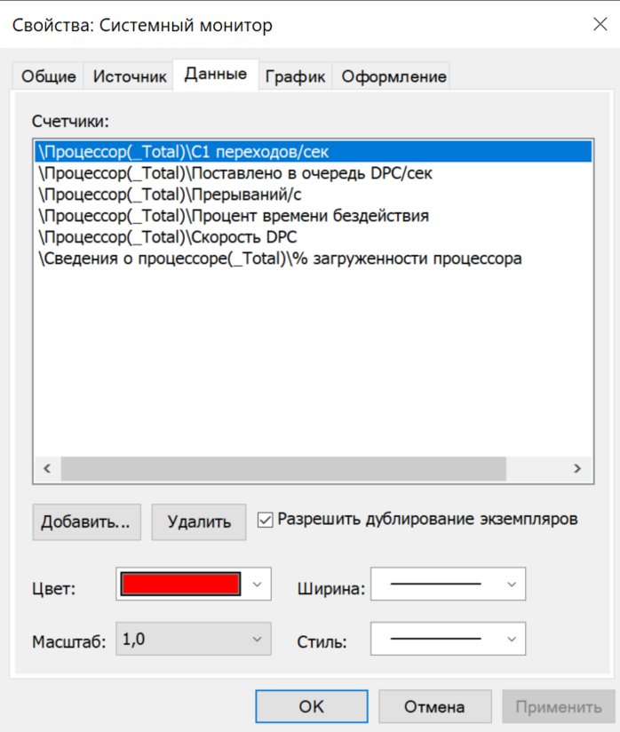 Выберите один или несколько счетчиков из списка. Чтобы добавить несколько счетчиков, выберите первый счётчик, затем нажмите и удерживайте клавишу Ctrl при выборе счетчиков.