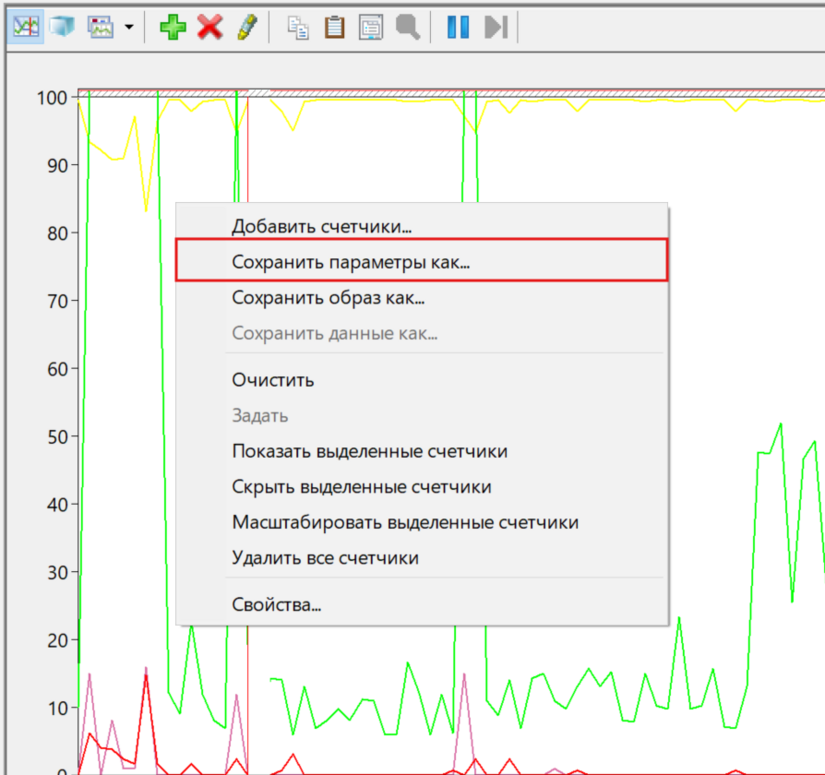 Здесь важно отметить, что при перезапуске монитора производительности все эти установленные счетчики и конфигурации будут потеряны по умолчанию. Чтобы сохранить эти настройки, щелкните правой кнопкой мыши график и выберите в меню «Сохранить параметры как».