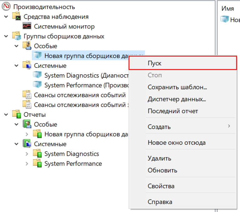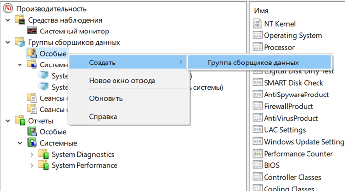 Перейдите в раздел «Группы сборщиков данных» на левой панели окна системного монитора. Нажмите правой кнопкой мыши по разделу «Особые», затем выберите «Создать» и нажмите «Группы сборщиков данных».