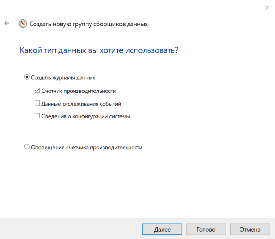 Выберите опцию «Создать журналы данных» и установите флажок «Счетчик производительности» и нажмите «Далее».