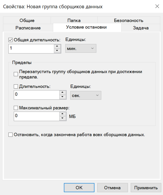 Нажмите на группу правой кнопкой мыши и выберите «Пуск», чтобы запустить его. Потом нажмите правой кнопкой мыши набор сборщиков данных и выберите «Свойства». Перейдите на вкладку «Условие остановки» и установите флажок «Общая длительность».
