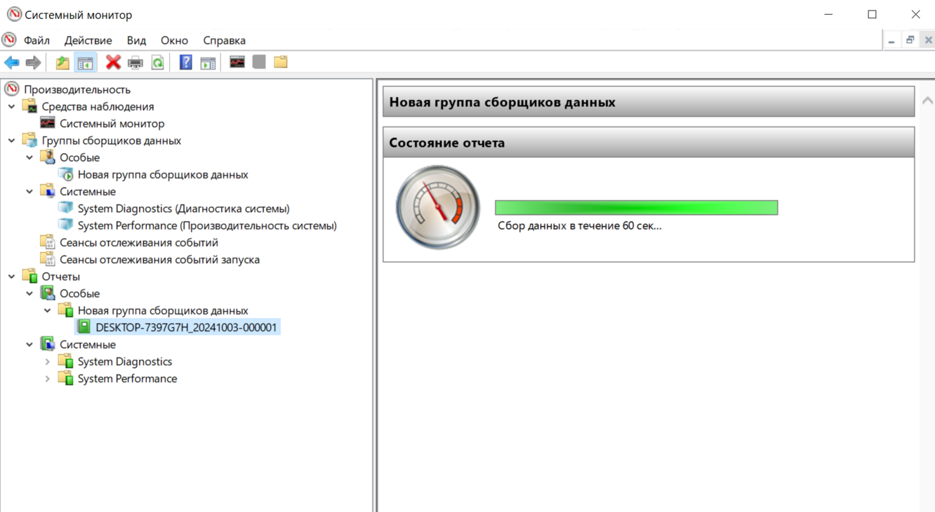 Слева вы найдете панель навигации с доступом к монитору производительности, наборам сборщиков данных и отчетам.