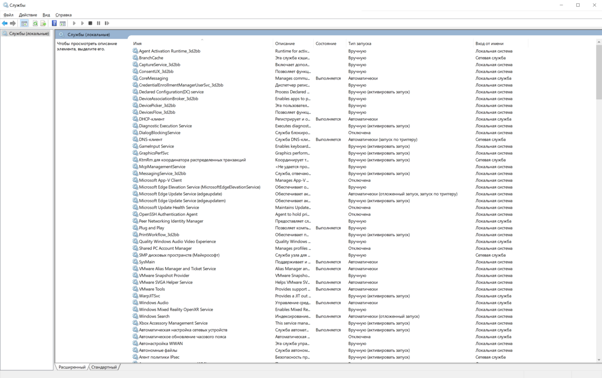Панель довольно проста: в ней есть список службы, столбец состояния, показывающий, запущены они или нет и дополнительная информация, такая как имя, описание, тип запуска службы и раздел вход от имени. Вы заметите, что не все службы работают постоянно.