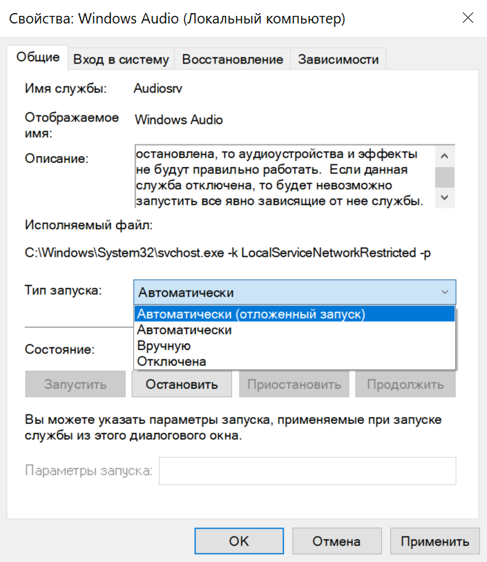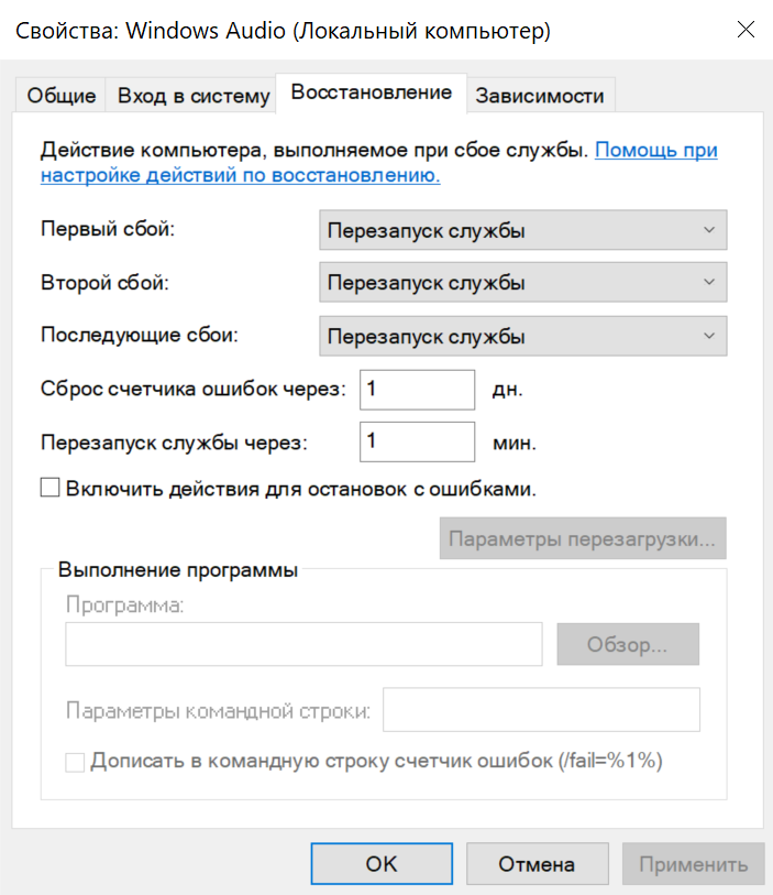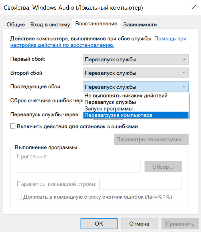 Вкладка «Восстановление» позволяет выбрать варианты действий при сбое службы: