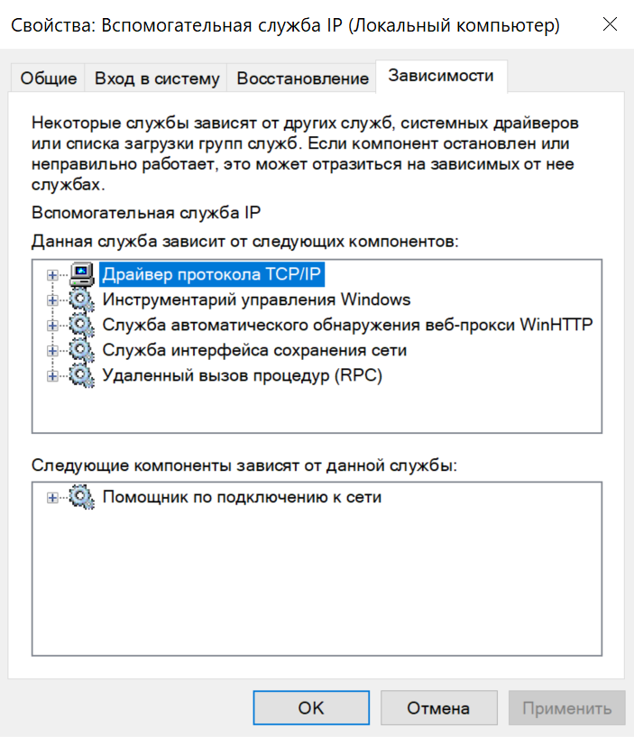 На вкладке зависимостей показано, какие службы зависят от конкретной службы, а какие службы зависят от того, на который вы смотрите. Если вы планируете отключить службу, вероятно, следует сначала ознакомиться с этим разделом, чтобы убедиться, что после отключения не сломаются другие компоненты.