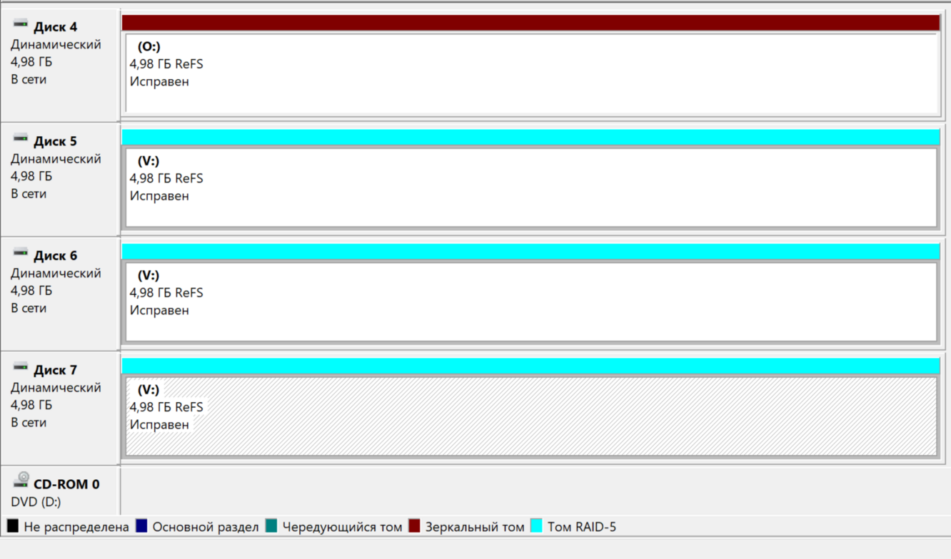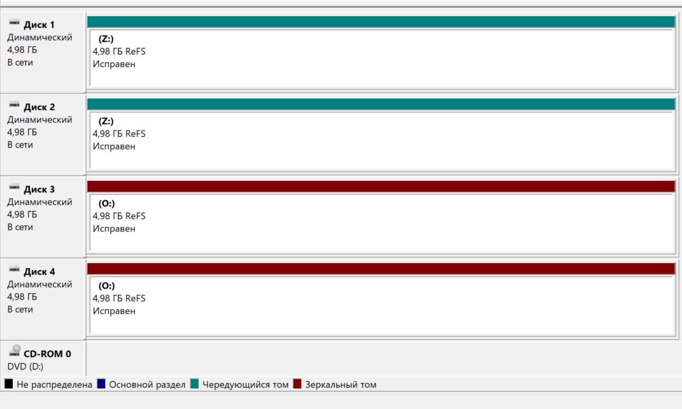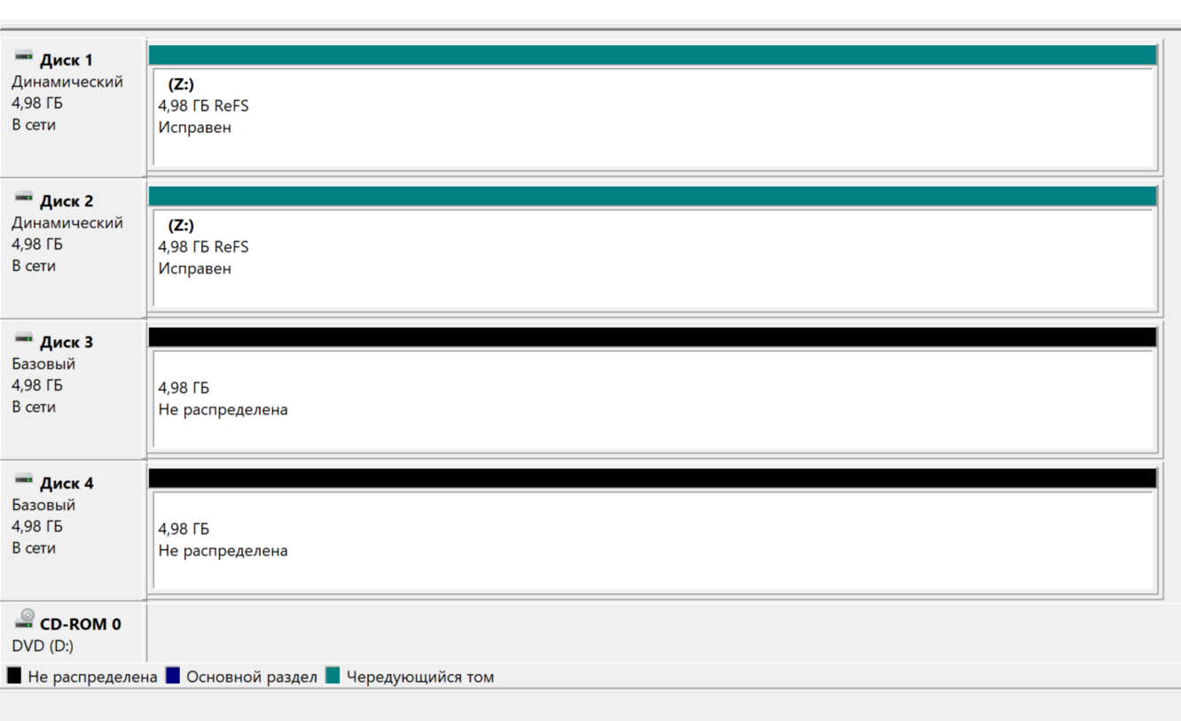 Обратите внимание на размер логического диска. Он получился в 2 раза меньше суммарного объема наших дисков.