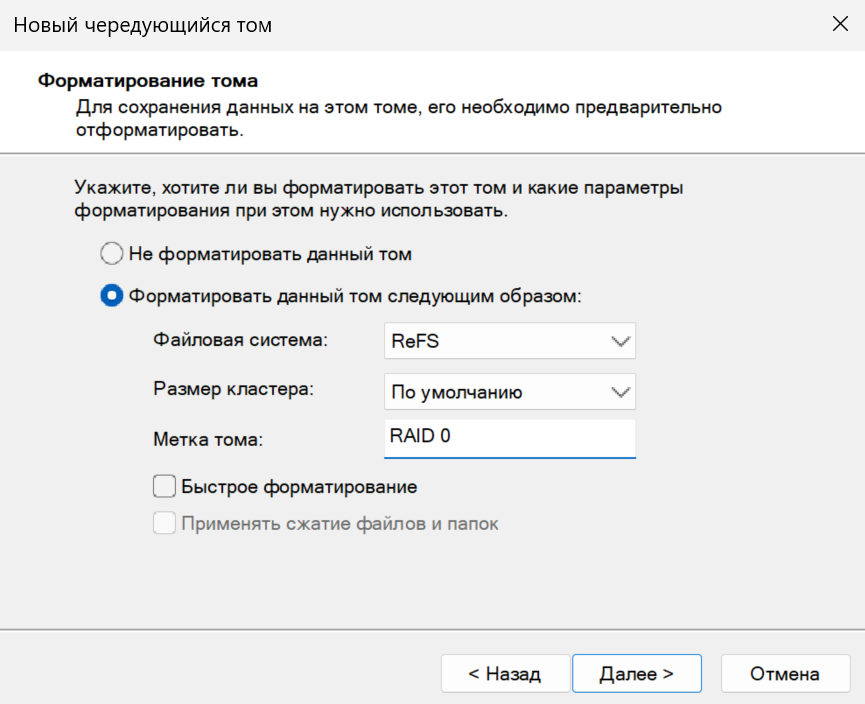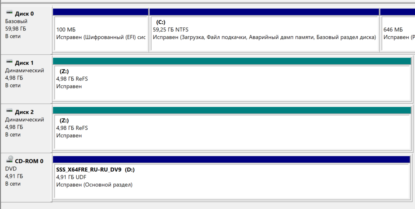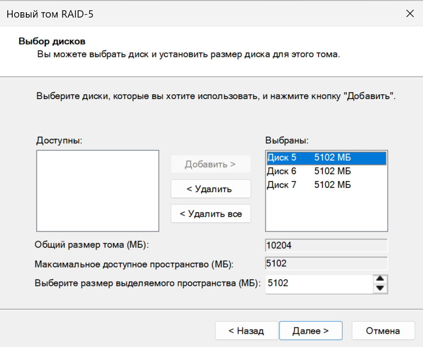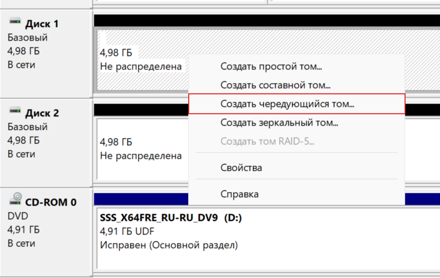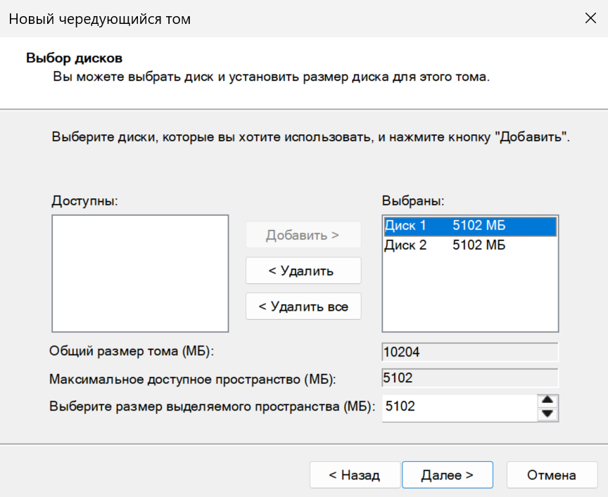 Обратите внимание на размер логического диска. Он получился в 2 раза меньше суммарного объема наших дисков.