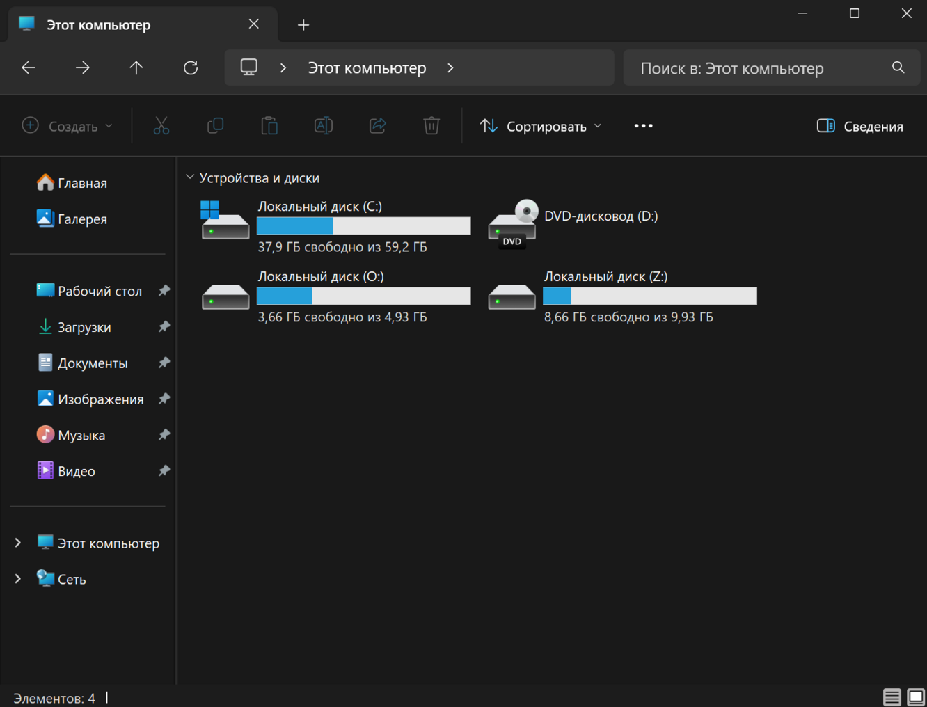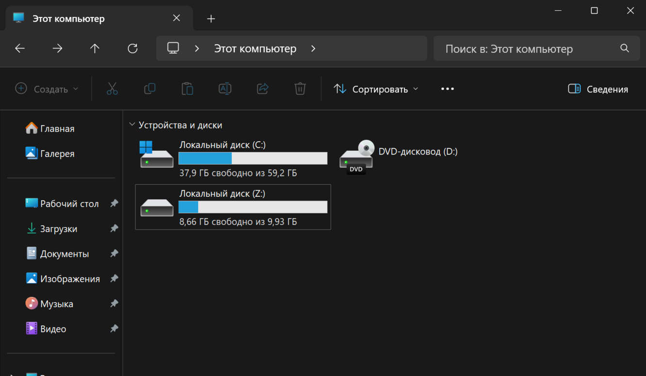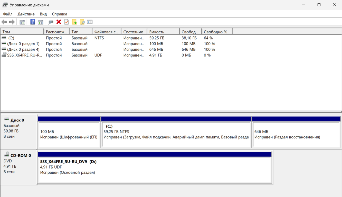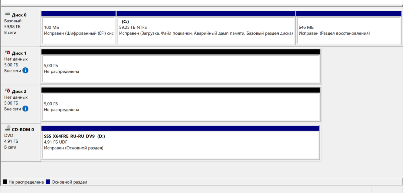 Вы увидите что у вас есть 1 диск (на нем уже рассмотренные ранее три раздела — системный, основной и восстановления) и 1 DVD диск (с него вы и устанавливали систему)