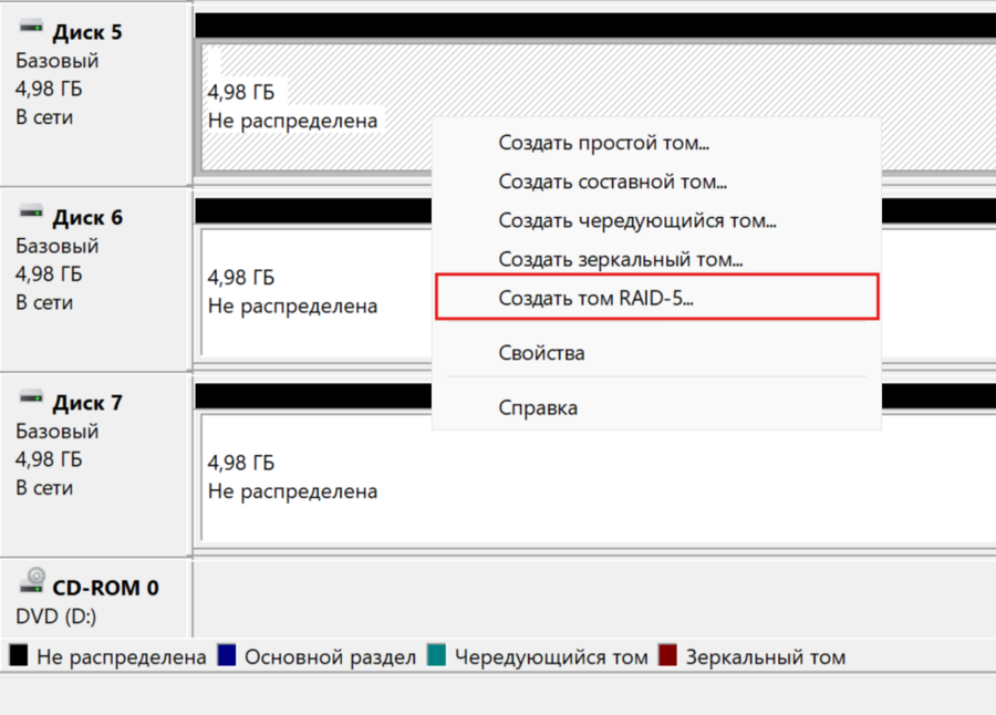 Средствами ОС Windows Server можно создать RAID 0 (чередующийся том), RAID 1 (зеркальный том), RAID 5 и JBOD(составной том).