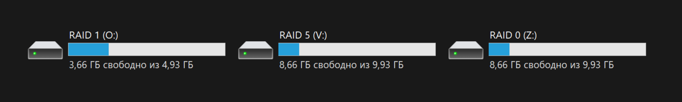 Обратите внимание на размер логического диска, так как мы создавали RAID 0 объем двух дисков сложился и получился диск размером 10Гб (часть диска уже занята под метаданные массива)