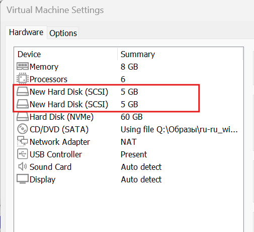 Откройте настройки ВМ и добавьте 2 диска по 5Gb: