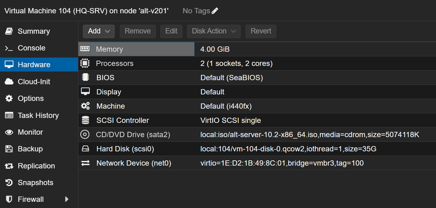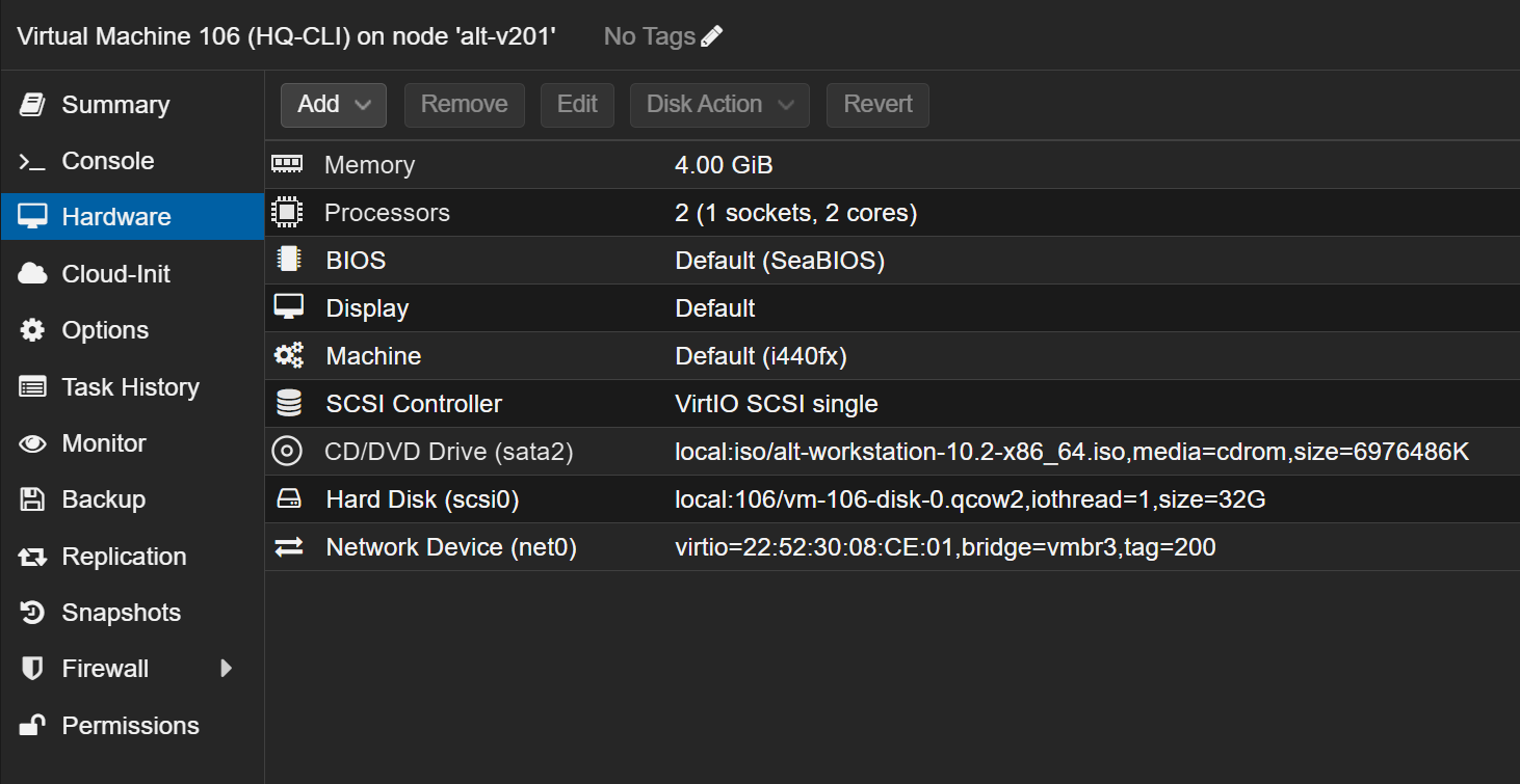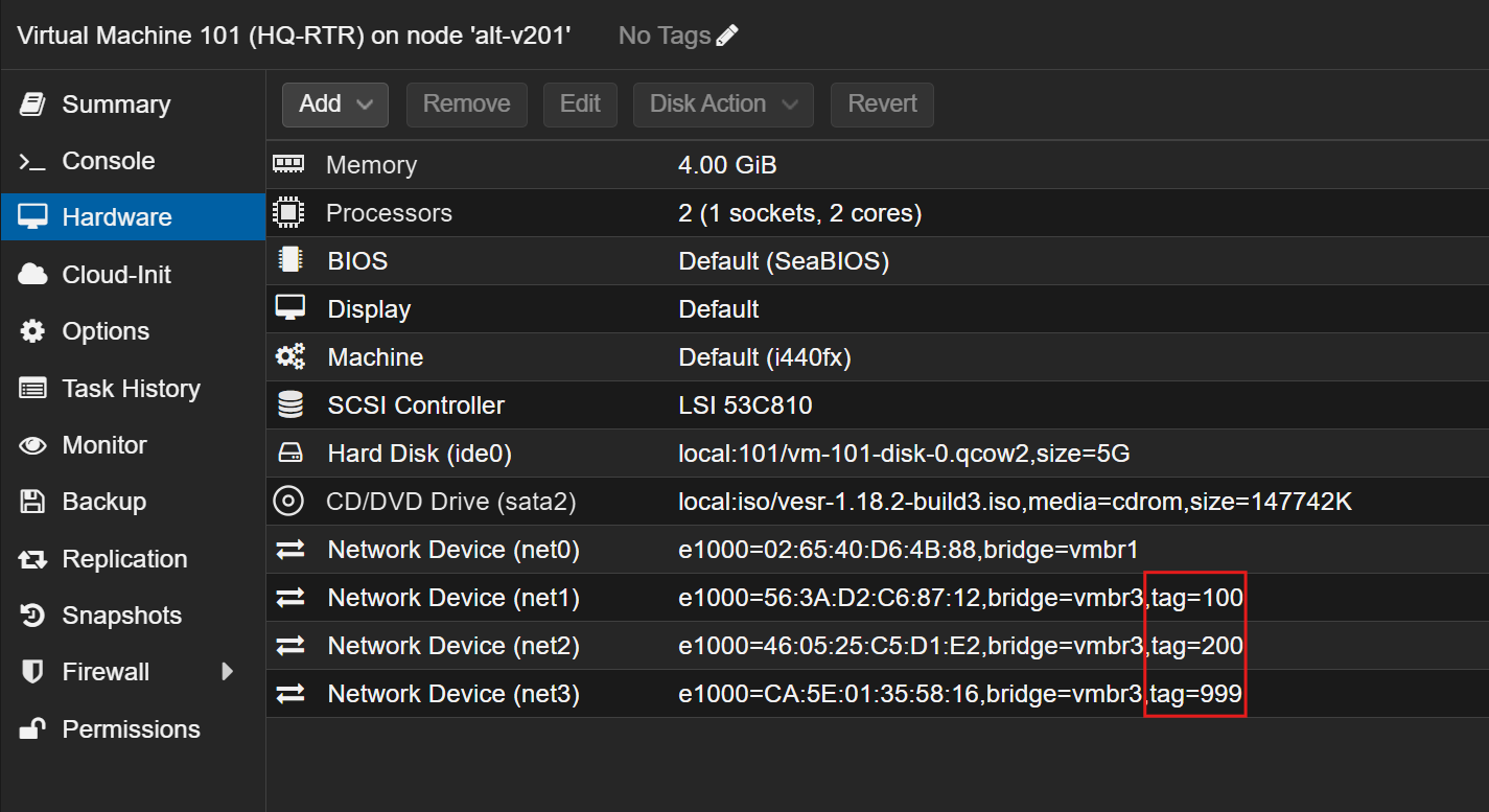 Использовать мы будем виртуальный коммутатор (bridge) vmbr3, на нем уже включен vlan aware для поддержки vlan тэгов. Для реализации сегментации переходим на вкладку Hardware каждой ВМ из офиса HQ и вешаем vlan тэги на интерфейсы: