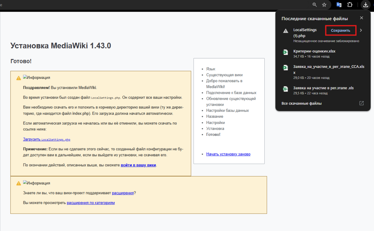 На последнем этапе у вас скачается конфиг LocalSettings.php
