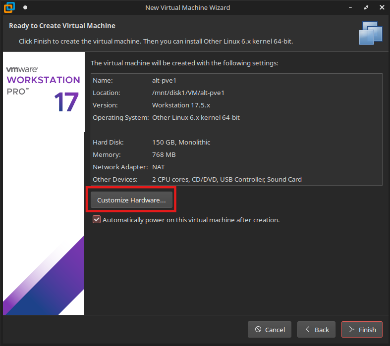 На завершающем этапе создания ВМ ALT-V переходим в "Customize Hardware" для тонкой настройки системных ресурсов: